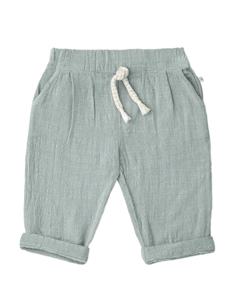 Seafoam green baby boy trousers in soft textured cotton offer the perfect lightweight layer for warm weather play and everyday comfort.
