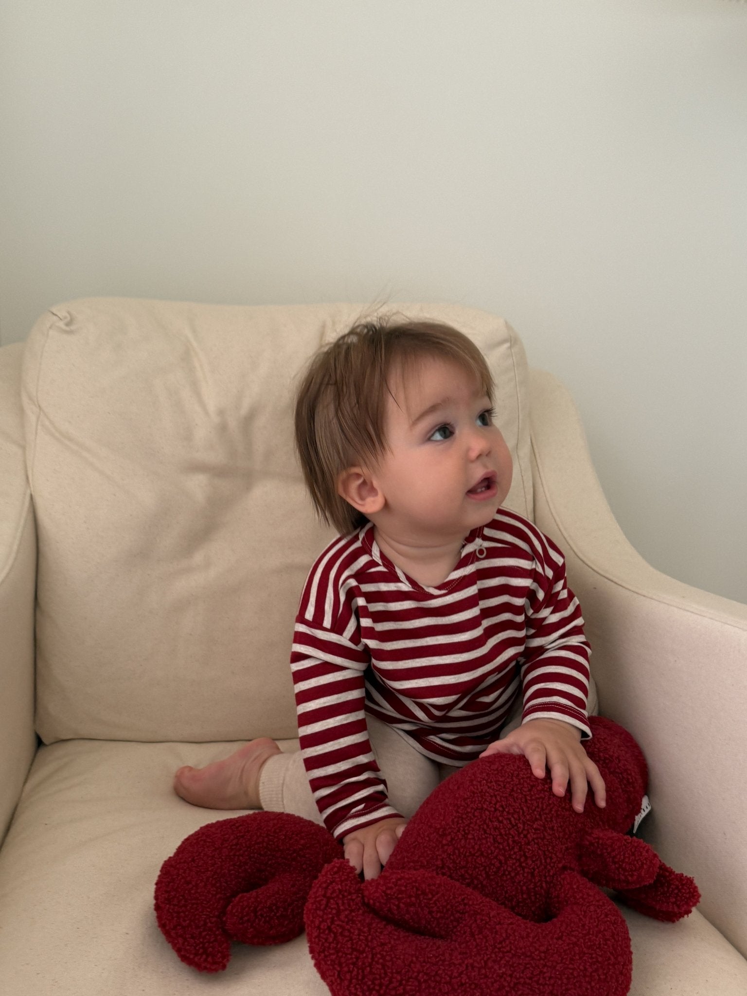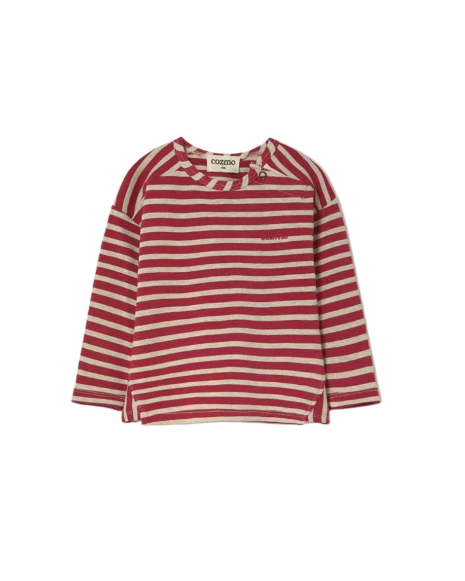 Striped fleece tee in red and white for baby and toddler boys, a cozy long sleeve essential for layering and everyday warmth. Crafted from recycled fleece with a brushed interior, it blends soft comfort with easy, relaxed style for cool weather days.