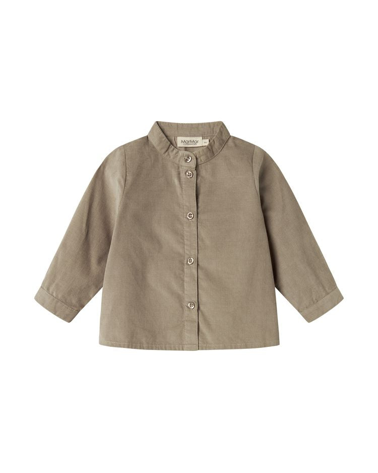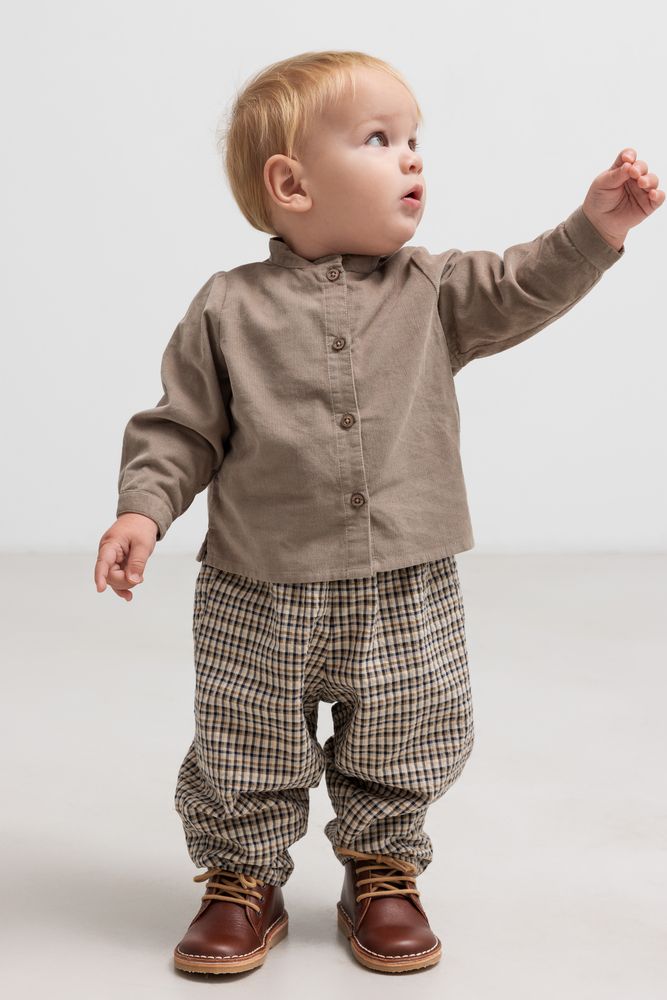 Soft cotton button down shirt for baby and toddler boys in a refined mud tone, designed for elevated everyday wear through fall and winter. Crafted from 100% cotton, it offers breathable softness and effortless sophistication for any occasion.