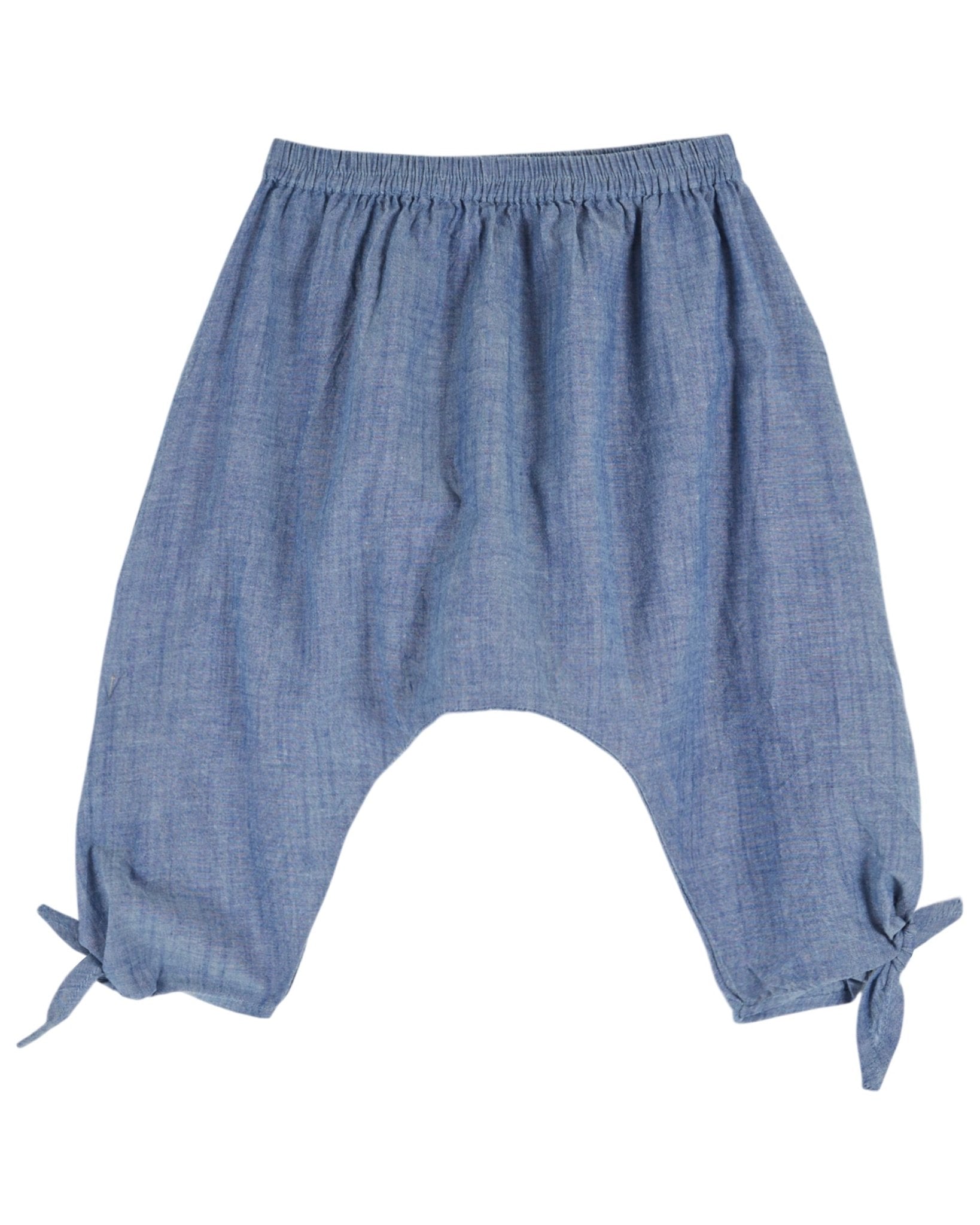 Chambray baby harem pants designed for breezy comfort with a relaxed silhouette and sweet tie details that elevate everyday dressing.