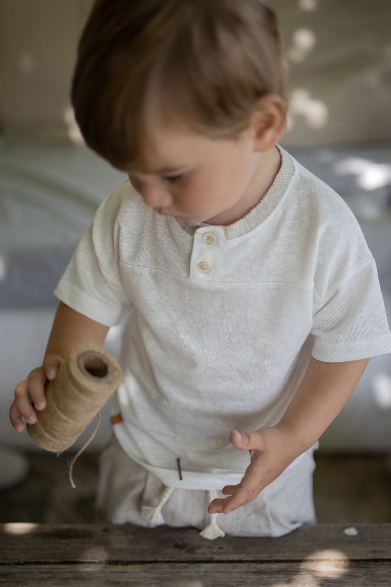 White baby Henley tee for baby boys and toddlers made from soft breathable cotton with a contrast textured neckline and sweet button detail for everyday comfort and style.