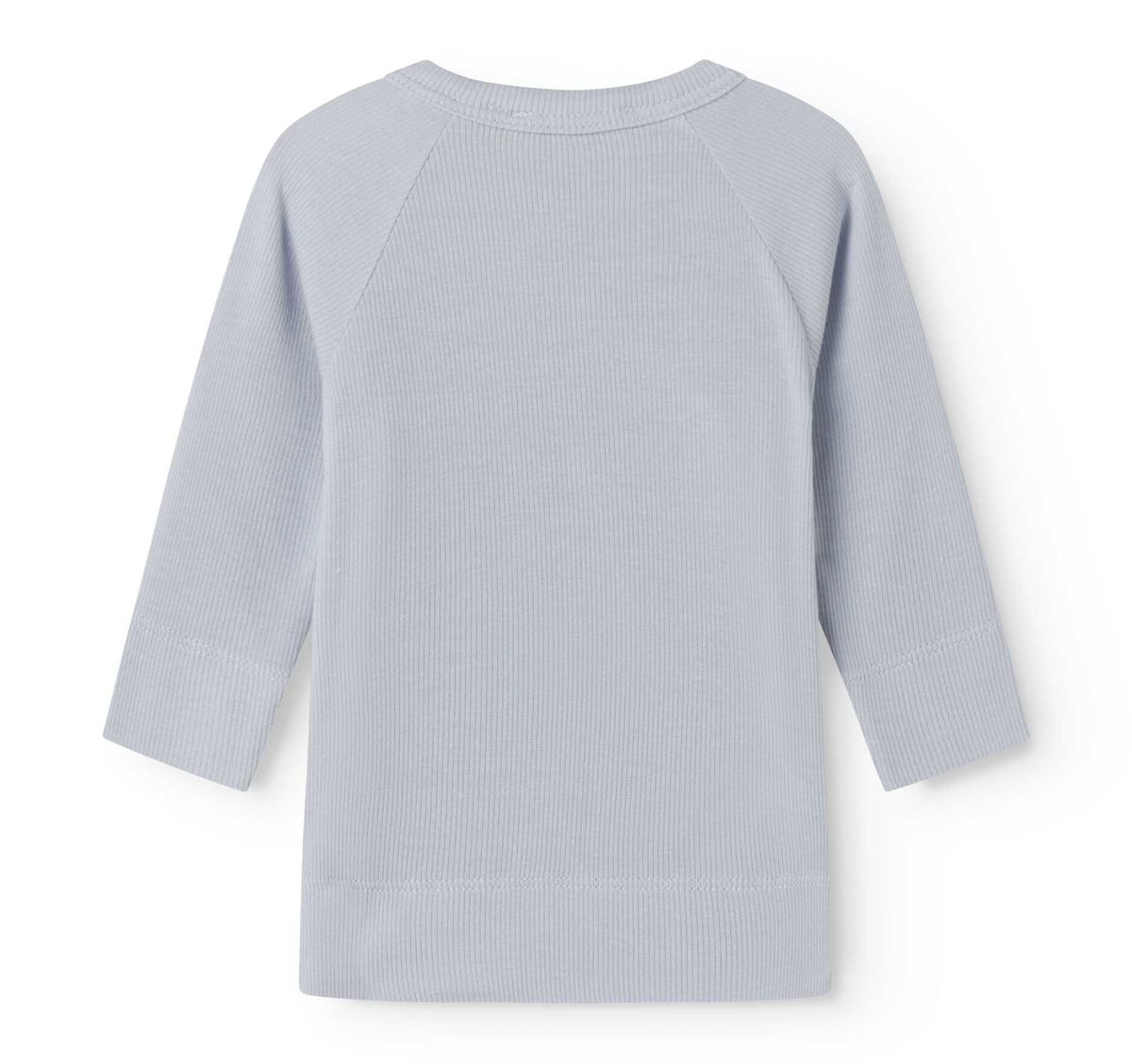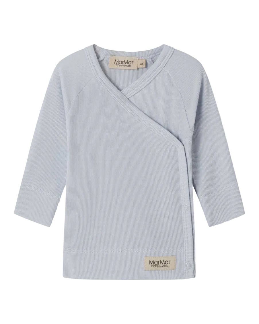 Long sleeve wrap top for newborns, babies, and toddlers from MarMar Copenhagen, a beloved European brand known for timeless design. In a sweet light, misty blue hue and gentle ribbed details, this soft, stretchy wrap top makes a perfect piece for early days at home and the perfect neutral look for newborn photos.