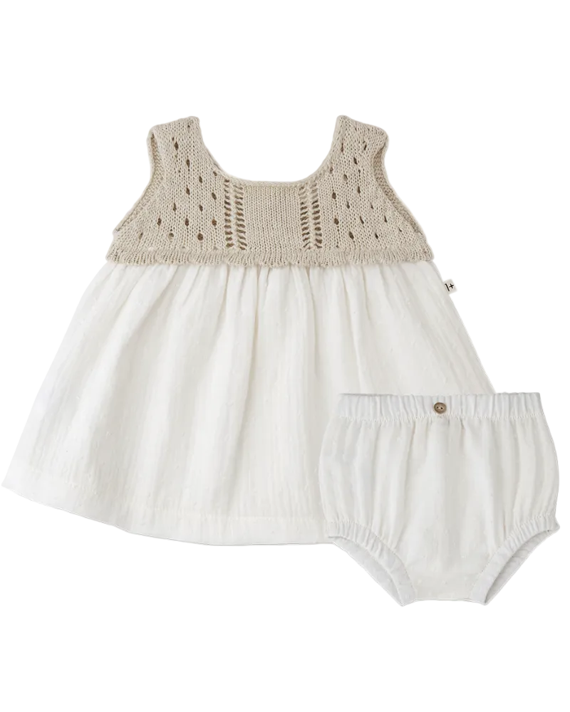 Girls Dress & Bloomer Set, White Crochet + Linen, Lola+1 in the family