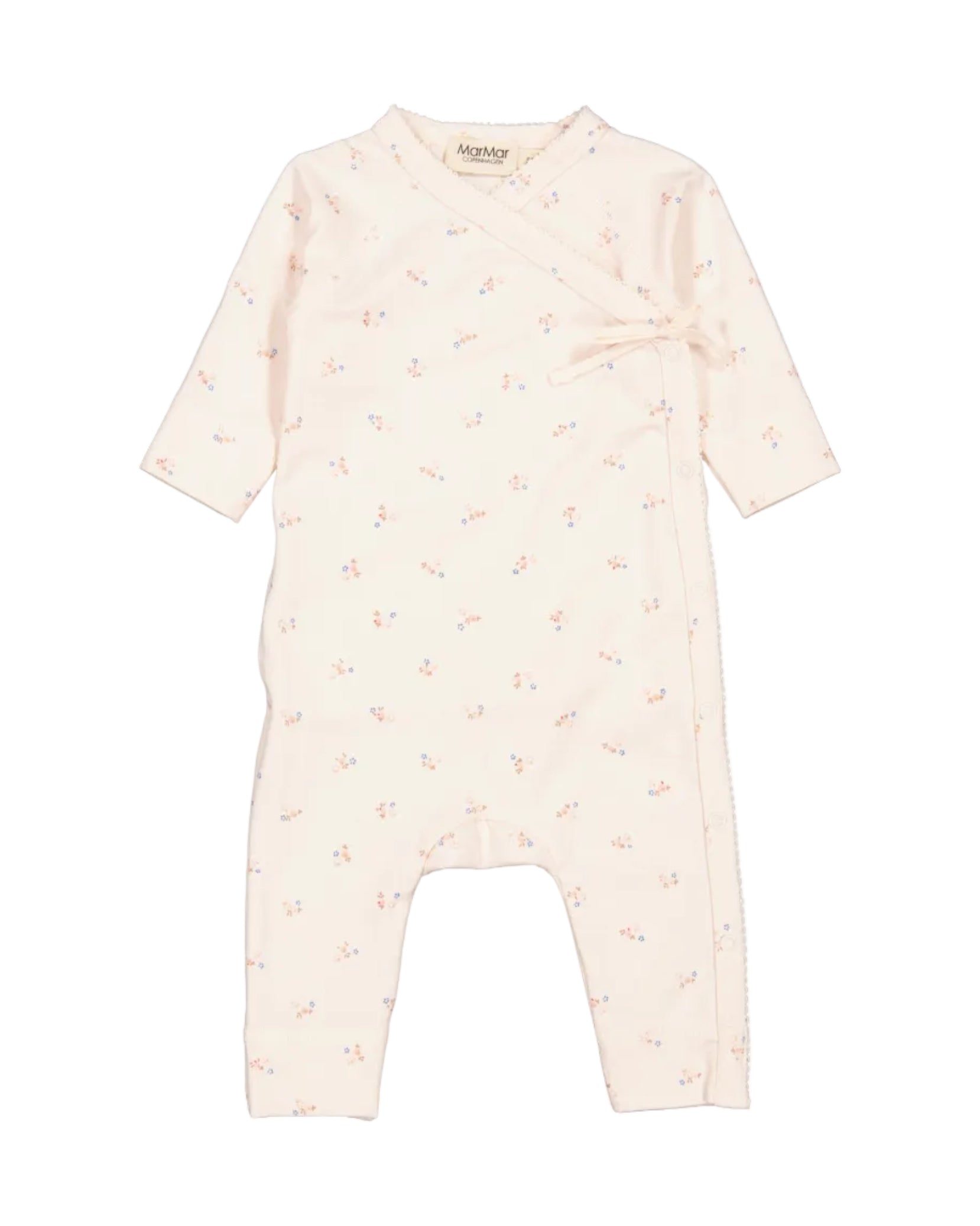 Long sleeve wrap romper from MarMar Copenhagen, a leading European baby brand known for timeless quality and design. Thoughtfully crafted with snap buttons along one side for easy dressing, this soft and stretchy romper features delicate picot edges, charming ribbons, and a classic floral print in soothing neutral tones.