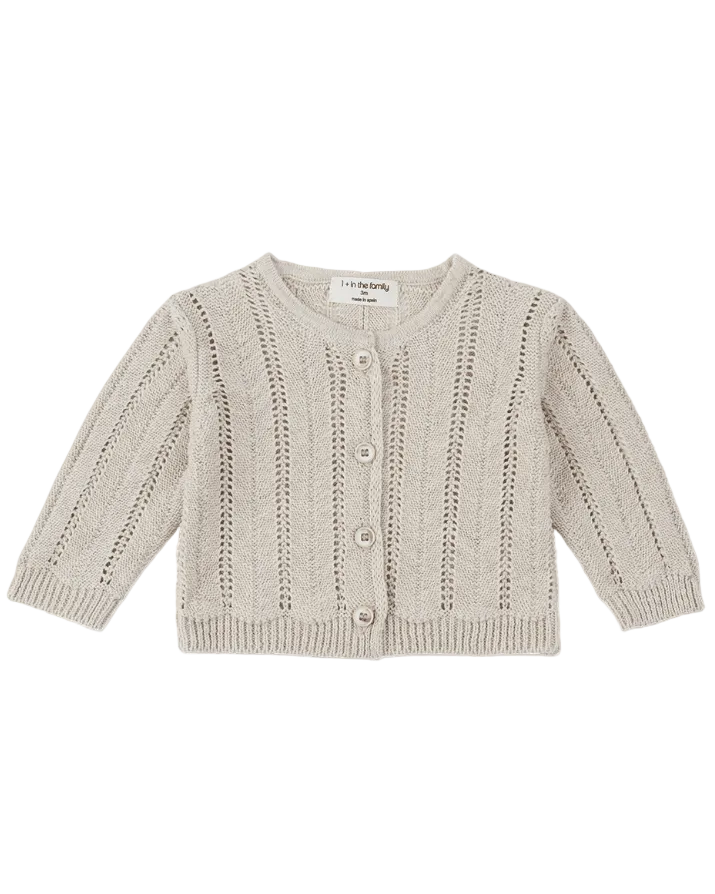 Soft knit cardigan from 1+ in the Family in a timeless neutral beige. Designed with a delicate open-knit texture and classic button front, this lightweight layer is perfect for keeping babies and toddlers cozy while adding an elevated touch to everyday outfits.
