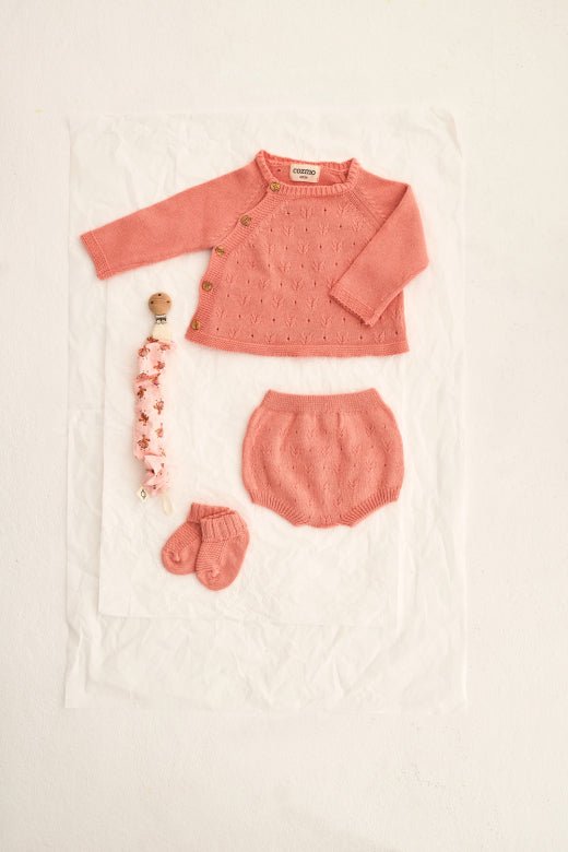 • Peach pink shade that pairs seamlessly with matching bloomers and knit sets