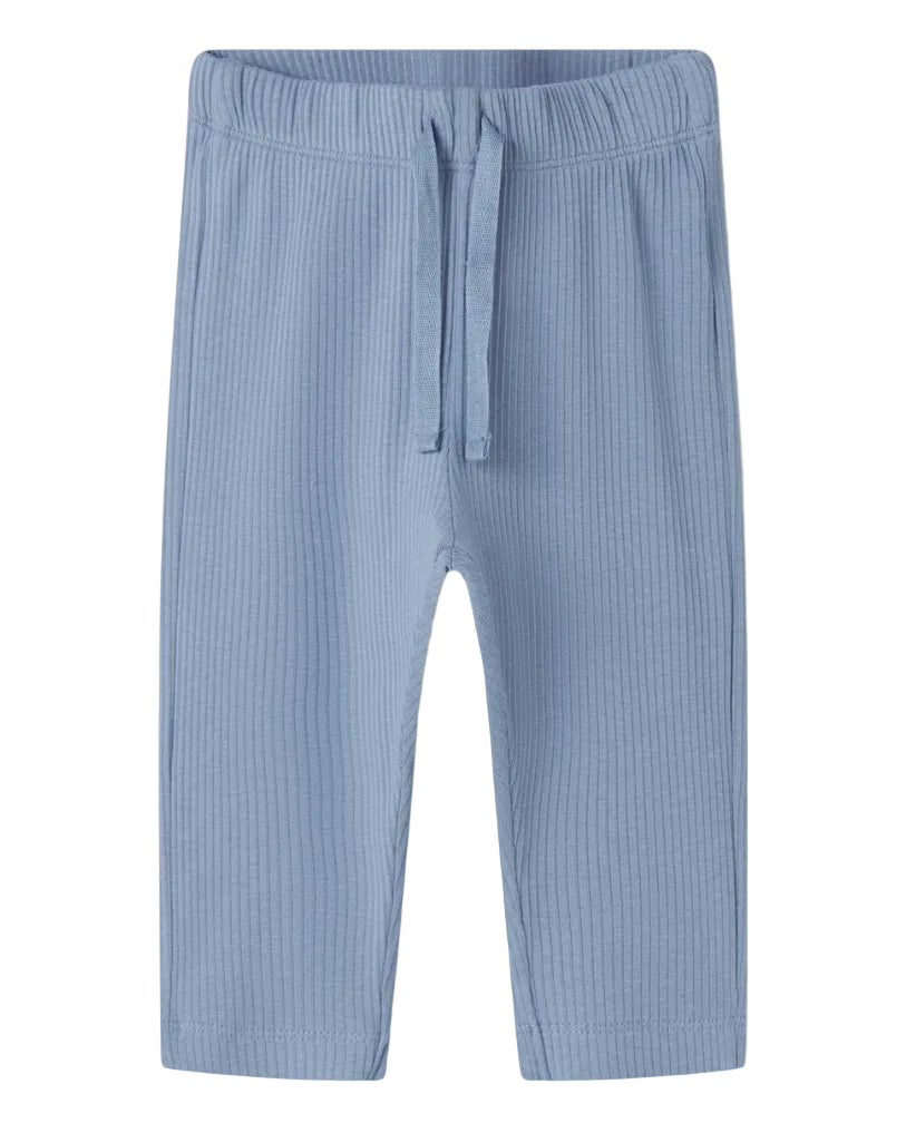 Ribbed pants from MarMar Copenhagen in a soft dusty blue. Made in a gentle stretch jersey, these everyday essentials offer a snug yet comfortable fit for babies and toddlers, perfect for play time, lounging, and easy layering.