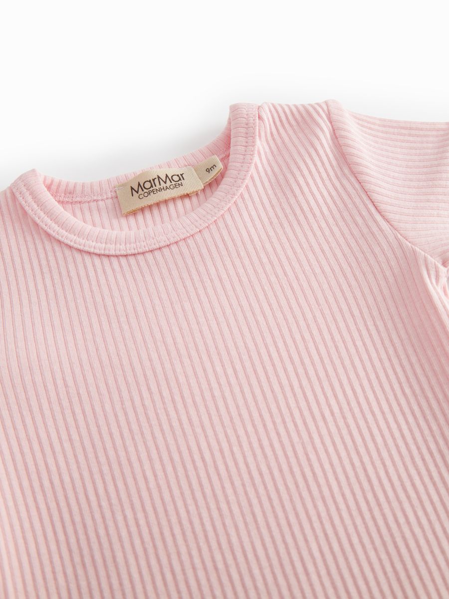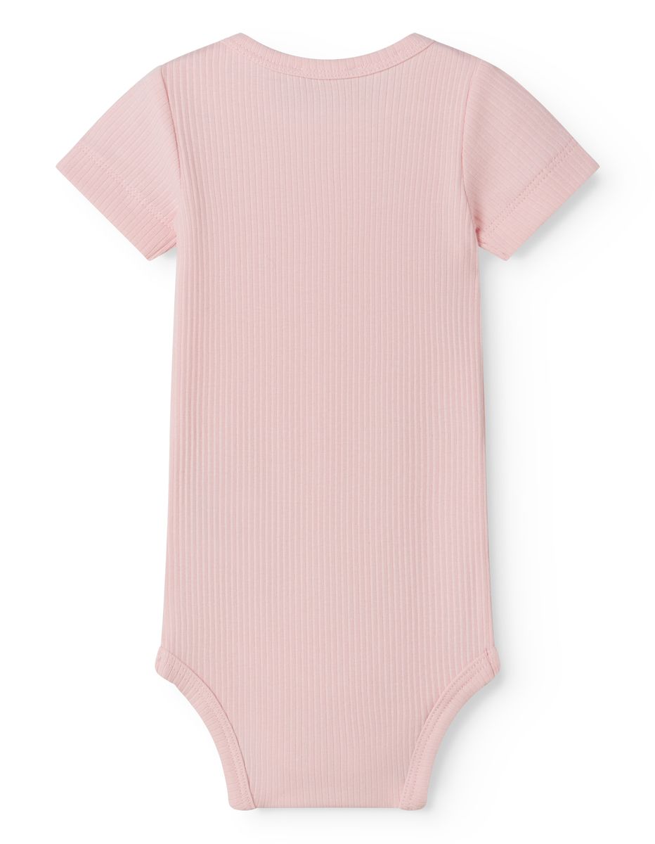 Short sleeve onesie from MarMar Copenhagen in a soft blush pink rib. Crafted from a gently stretchy jersey, this everyday essential offers a snug, comfortable fit for babies, perfect for warm days, layering, and year round wear.