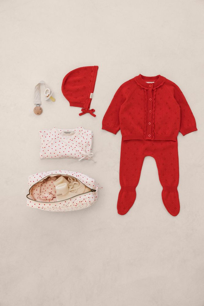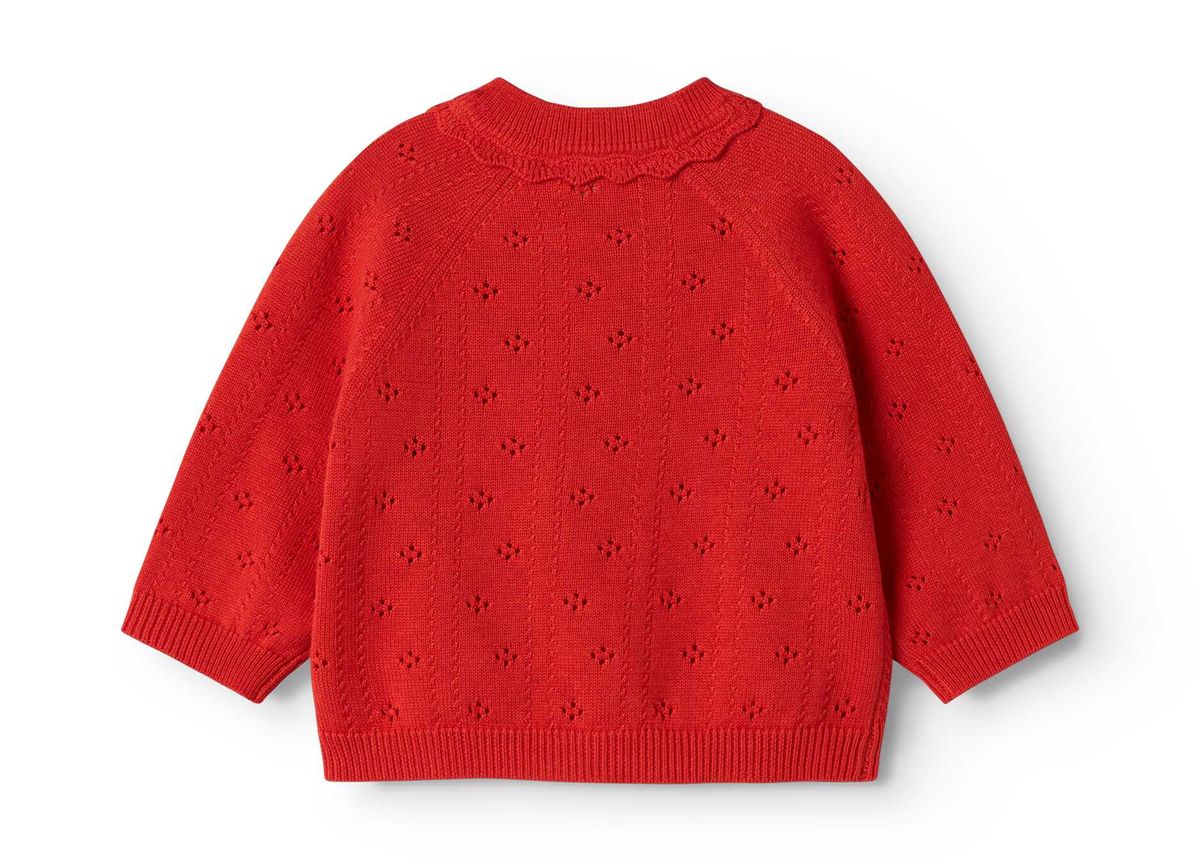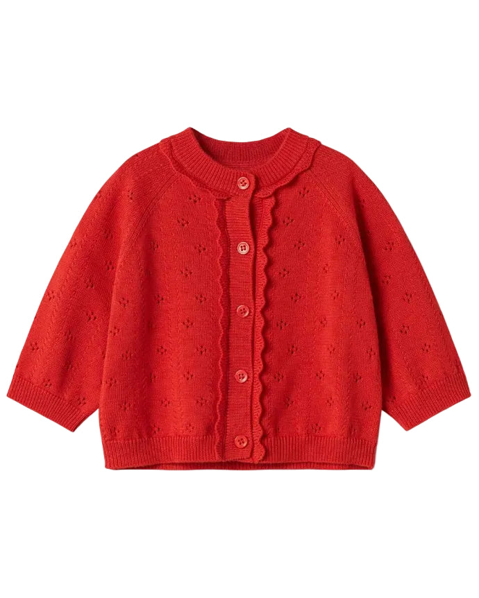 Soft knit cardigan from MarMar Copenhagen in a vibrant poppy red with delicate pointelle detailing. Designed with a sweet scalloped button placket and a cozy, breathable knit, this timeless layer adds warmth and charm to any baby or toddler outfit.