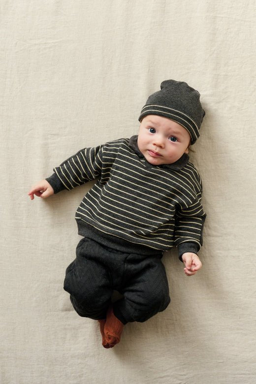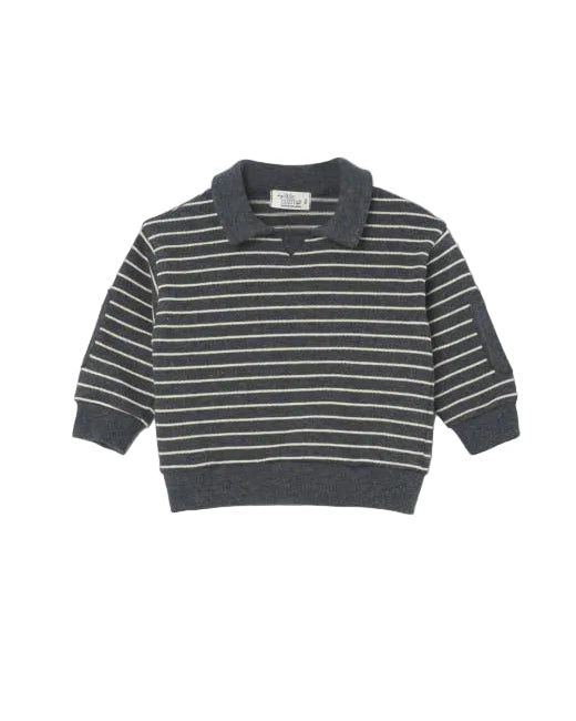 Grey and cream striped collared pullover for baby boys and toddlers, a cozy winter essential designed for warmth and everyday charm. Made from soft cotton knit, it offers breathable comfort with timeless style and thoughtful detailing.