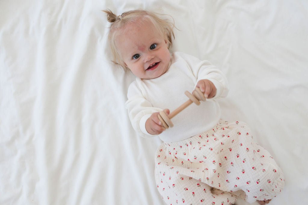 Lightweight slightly quilted texture bottoms and red cherry print brighten your babe's wardrobe. Ideal for warmer weather thanks to breathable cotton, the Sausage Pant brings pop of fun that is easy to pair easy for layering.