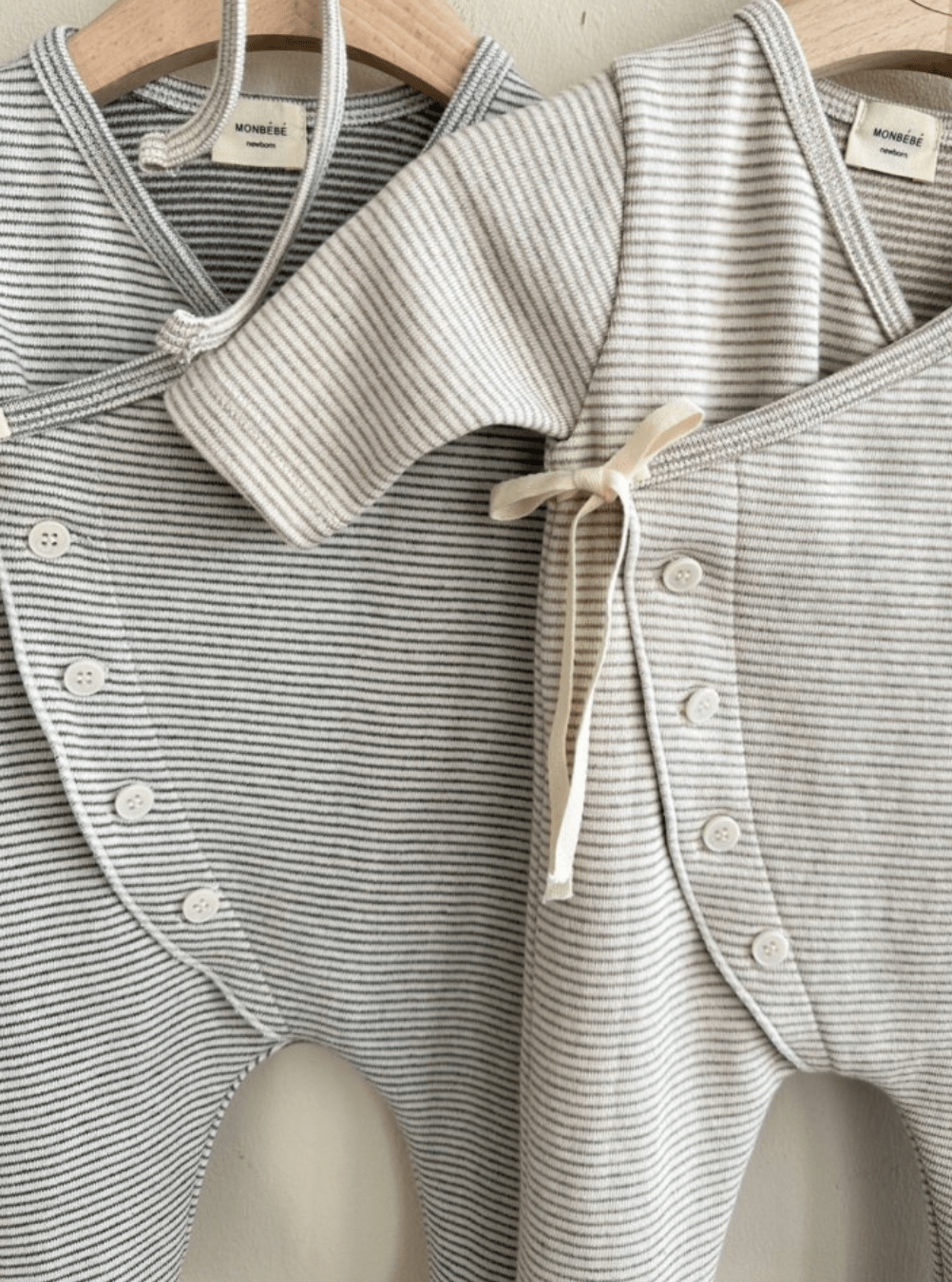 Striped baby footie onesie and matching hat set, a charming two-piece outfit for newborns that adds subtle pattern and movement to a neutral wardrobe. Designed with soft fabrics, traditional button closures, and ribbon details, this set blends comfort, style, and keepsake-quality craftsmanship.
