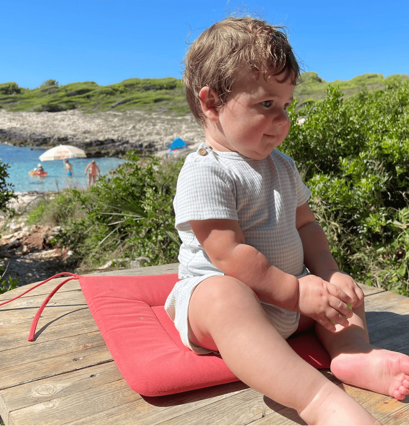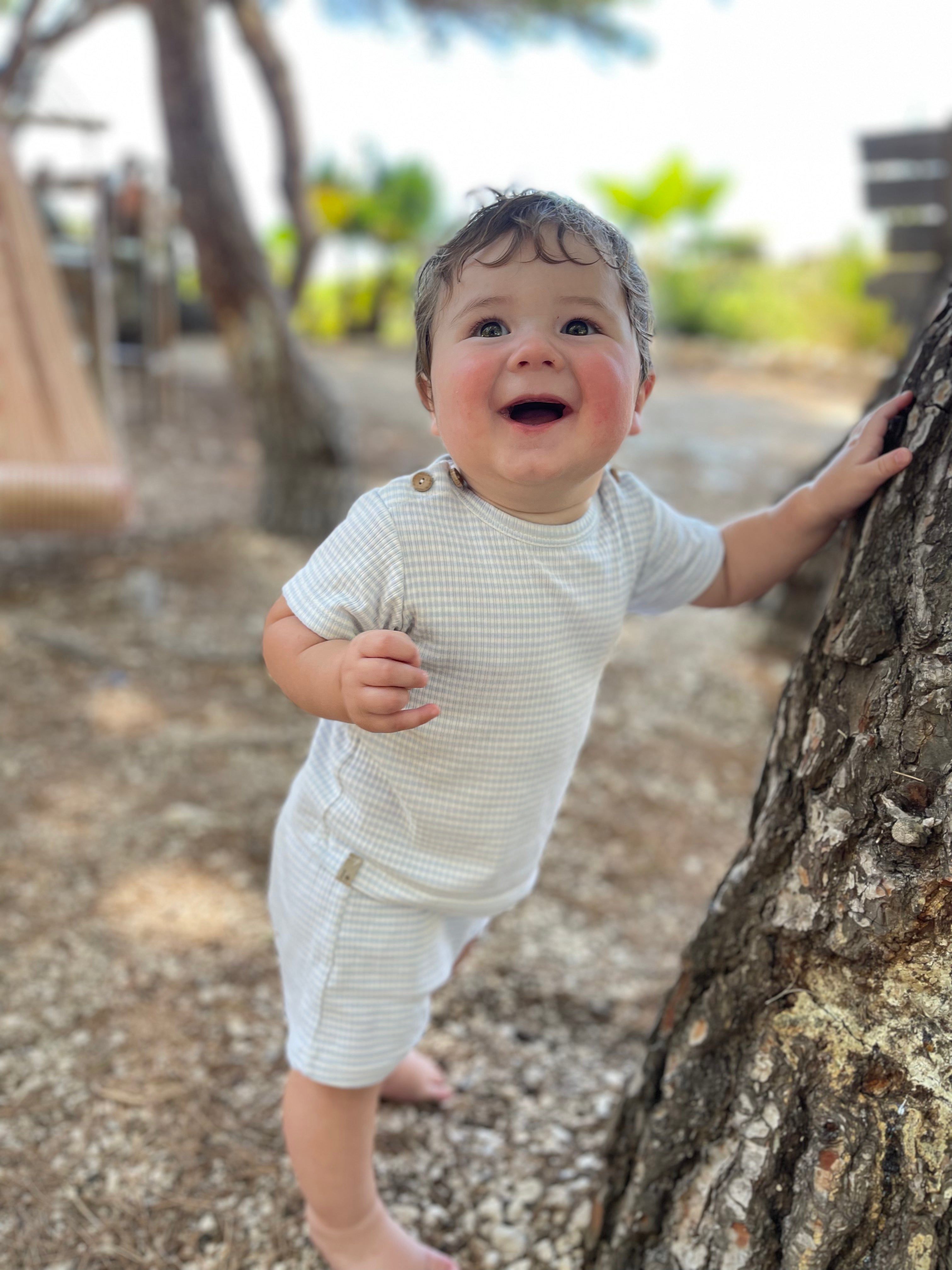 Striped baby boy shorts in misty blue from 1+ In The Family, a soft and timeless summer essential crafted in a smooth cotton modal blend. These lightweight Bermuda shorts offer effortless comfort, stretch, and Scandinavian-inspired simplicity for sunny days and playtime adventures.