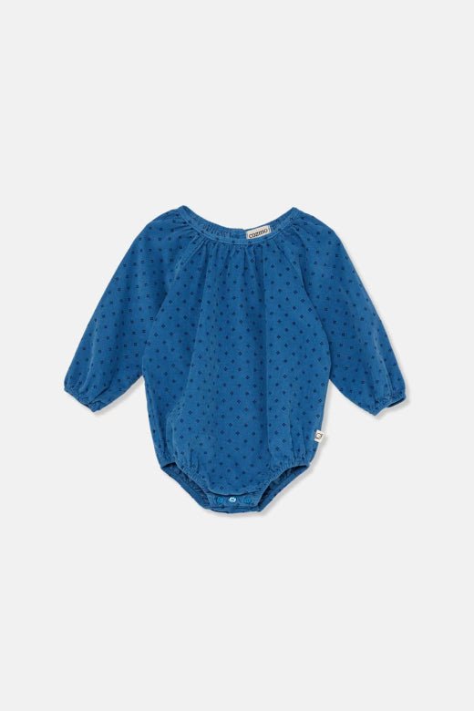 Long sleeve corduroy romper in royal blue for baby girls and toddlers, a timeless piece perfect for cozy fall and winter layering. Designed with a delicate geometric print and a relaxed fit, it offers softness, breathability, and freedom of movement for everyday comfort.