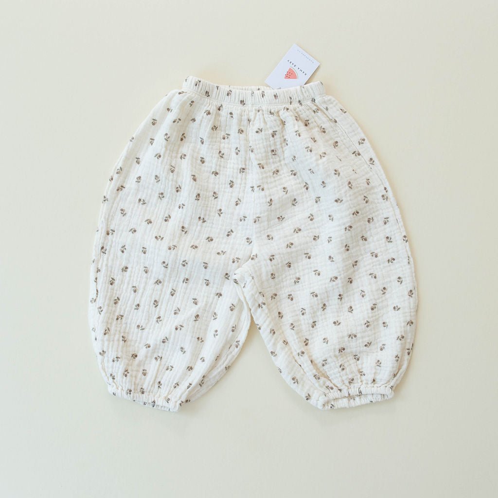 Lightweight slightly quilted texture bottoms and gender neutral beige cherry print brighten your babe's wardrobe. Ideal for warmer weather thanks to breathable cotton, the Sausage Pant brings pop of fun that is easy to pair easy for layering.