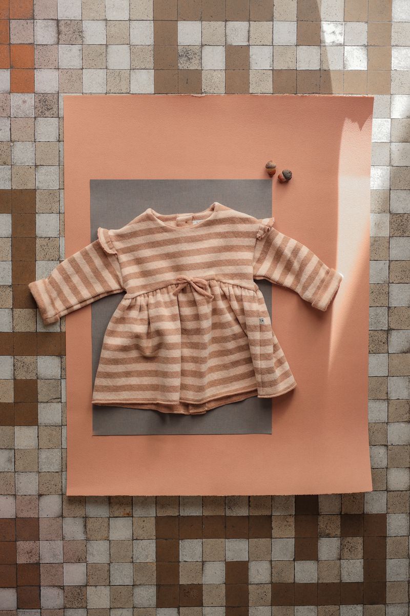 Striped fleece dress in nude tone for baby and toddler girls, a cozy and elegant winter outfit that blends comfort, warmth, and timeless charm.