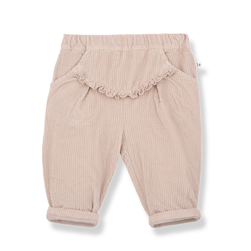 Pink corduroy pants for baby and toddler girls, a chic trouser for everyday wear and special occasions. Crafted from light pink cotton corduroy with charming ruffle trim, they feel soft and look polished for any outing.