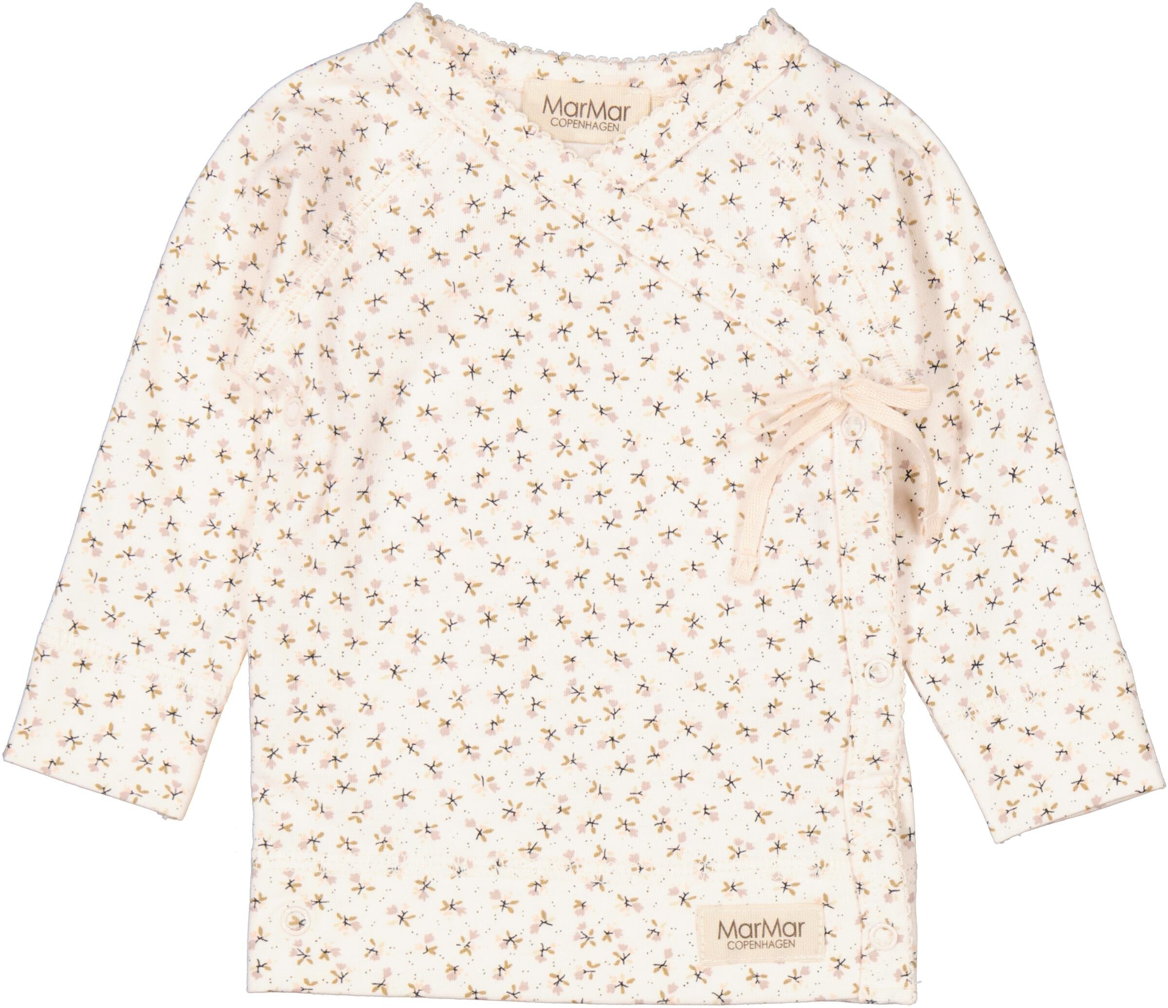 Long sleeve wrap top from MarMar Copenhagen with a playful petites fleurs floral print on a soft neutral base and delicate picot edging. Crafted for gentle comfort and easy dressing, it brings a sweet, timeless look to everyday outfits and special moments.
