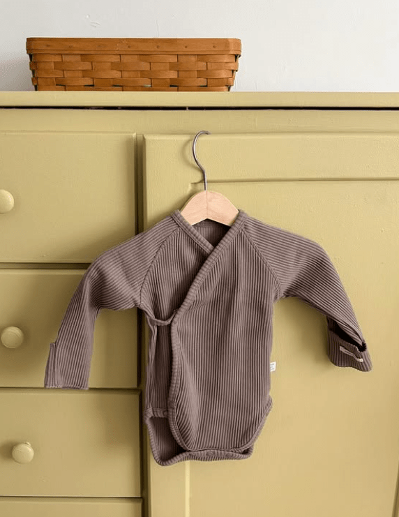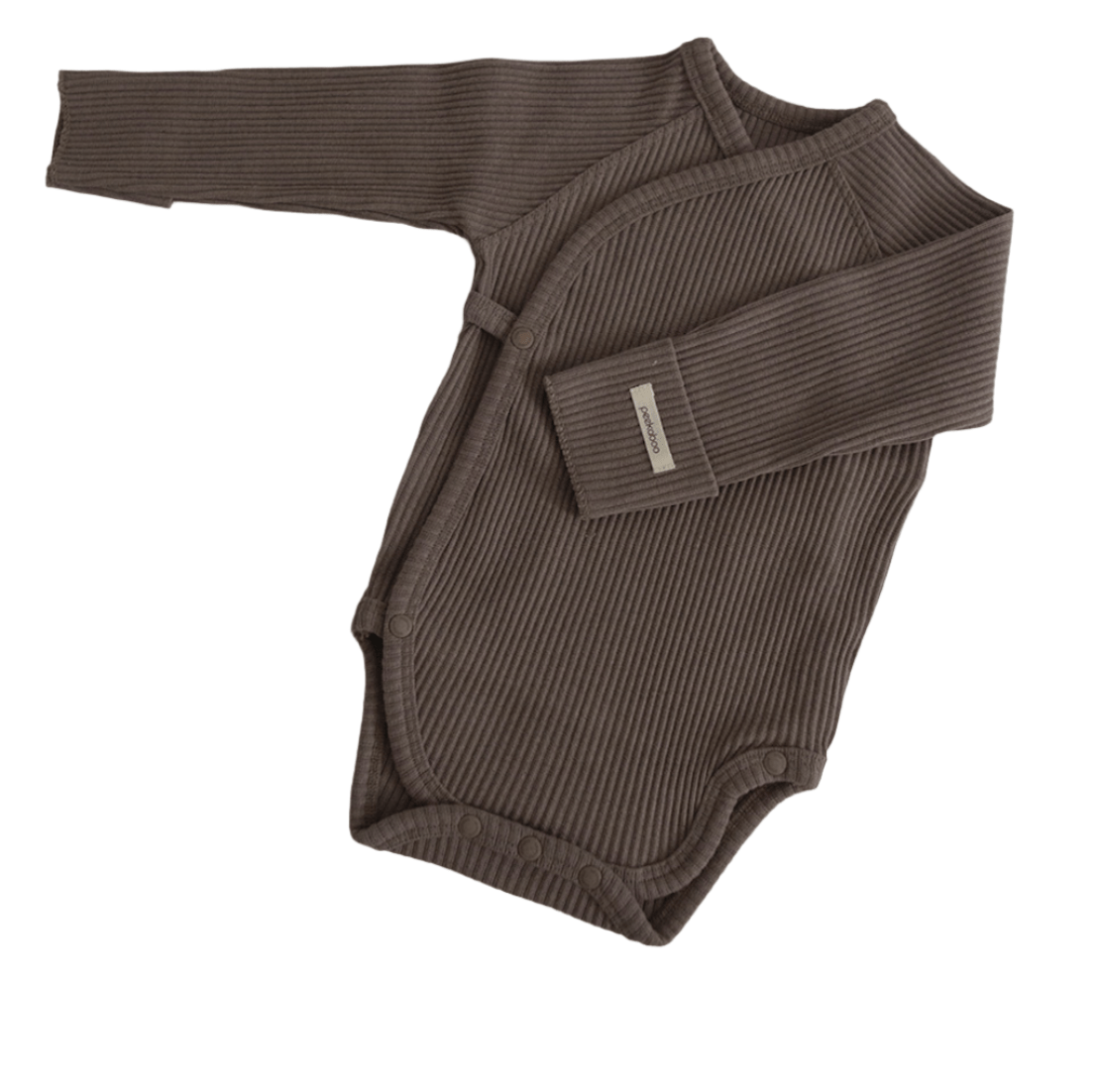 Brown ribbed baby wrap onesie with long sleeves, a gentle everyday essential crafted for breathable comfort and easy changes.