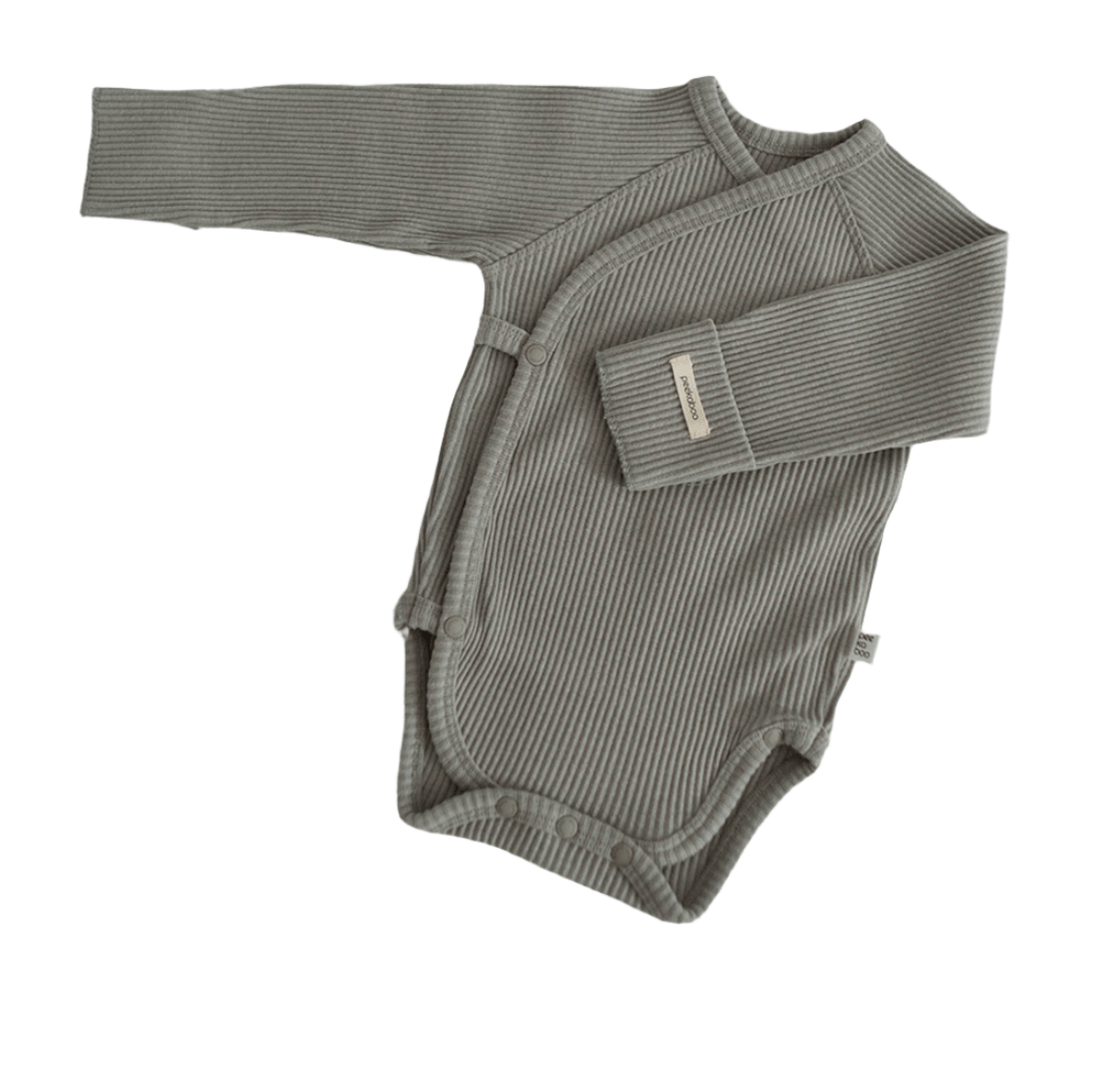 Sage green ribbed baby wrap onesie with long sleeves, a gentle everyday essential crafted for breathable comfort and easy changes.
