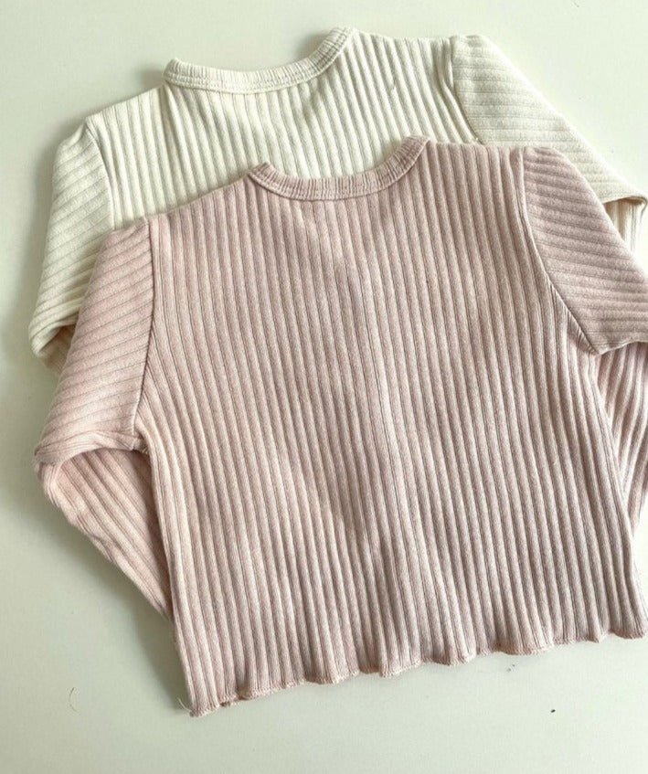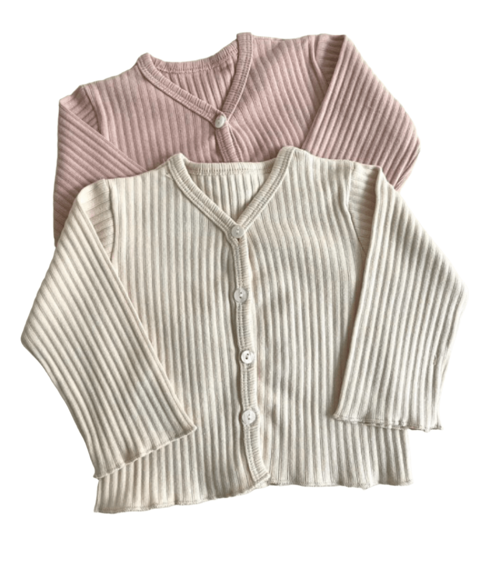 White ribbed knit baby and toddler cardigans with button front—versatile layering pieces designed for comfort and modern style.