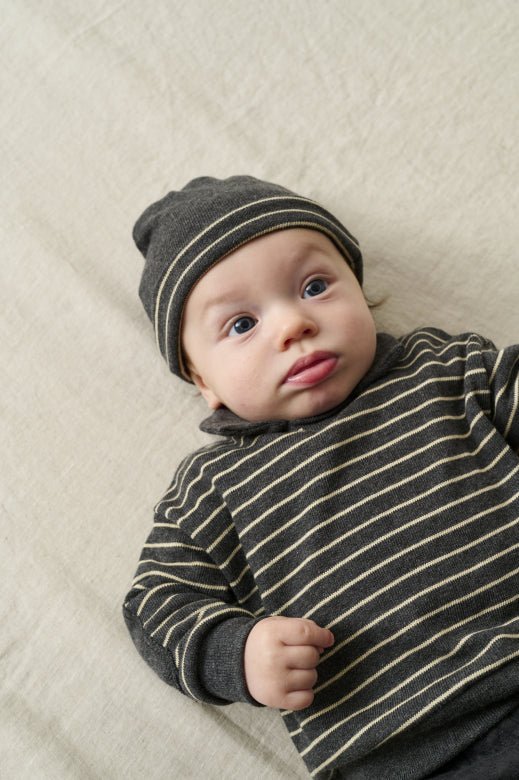 Grey and cream striped collared pullover for baby boys and toddlers, a cozy winter essential designed for warmth and everyday charm. Made from soft cotton knit, it offers breathable comfort with timeless style and thoughtful detailing.