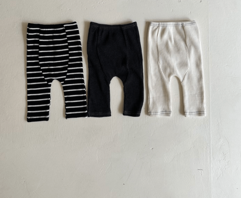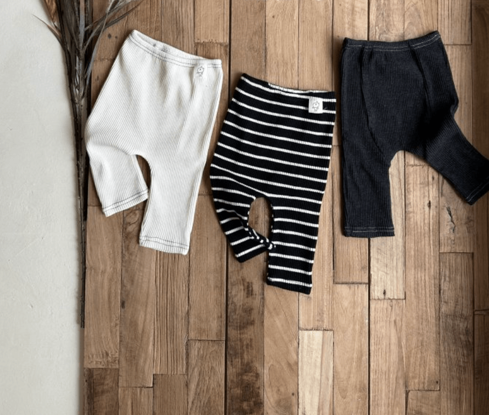 Ribbed legging pants in cream with navy blue outline stitching for added texture. These baby jeggings are stretchy and comfy for layering or wearing alone.