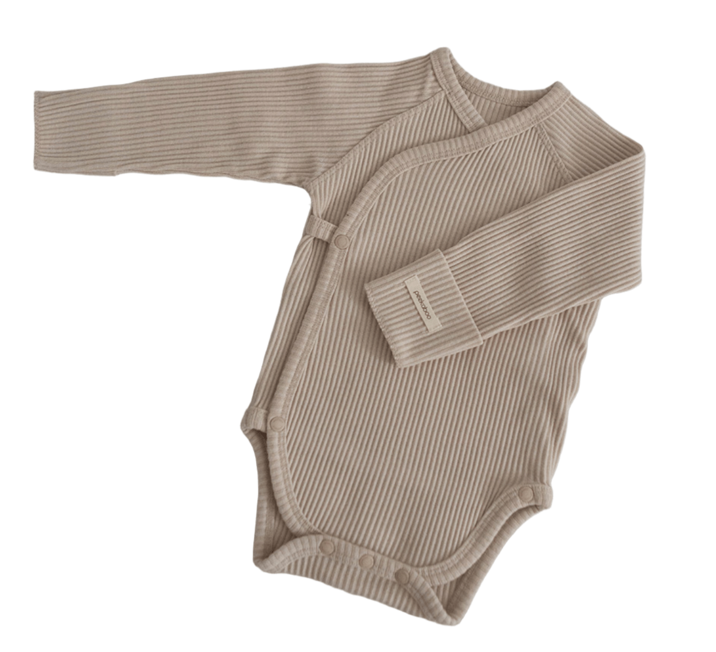 Beige ribbed baby wrap onesie with long sleeves, a cozy and gentle everyday essential designed for breathable comfort and easy dressing.
