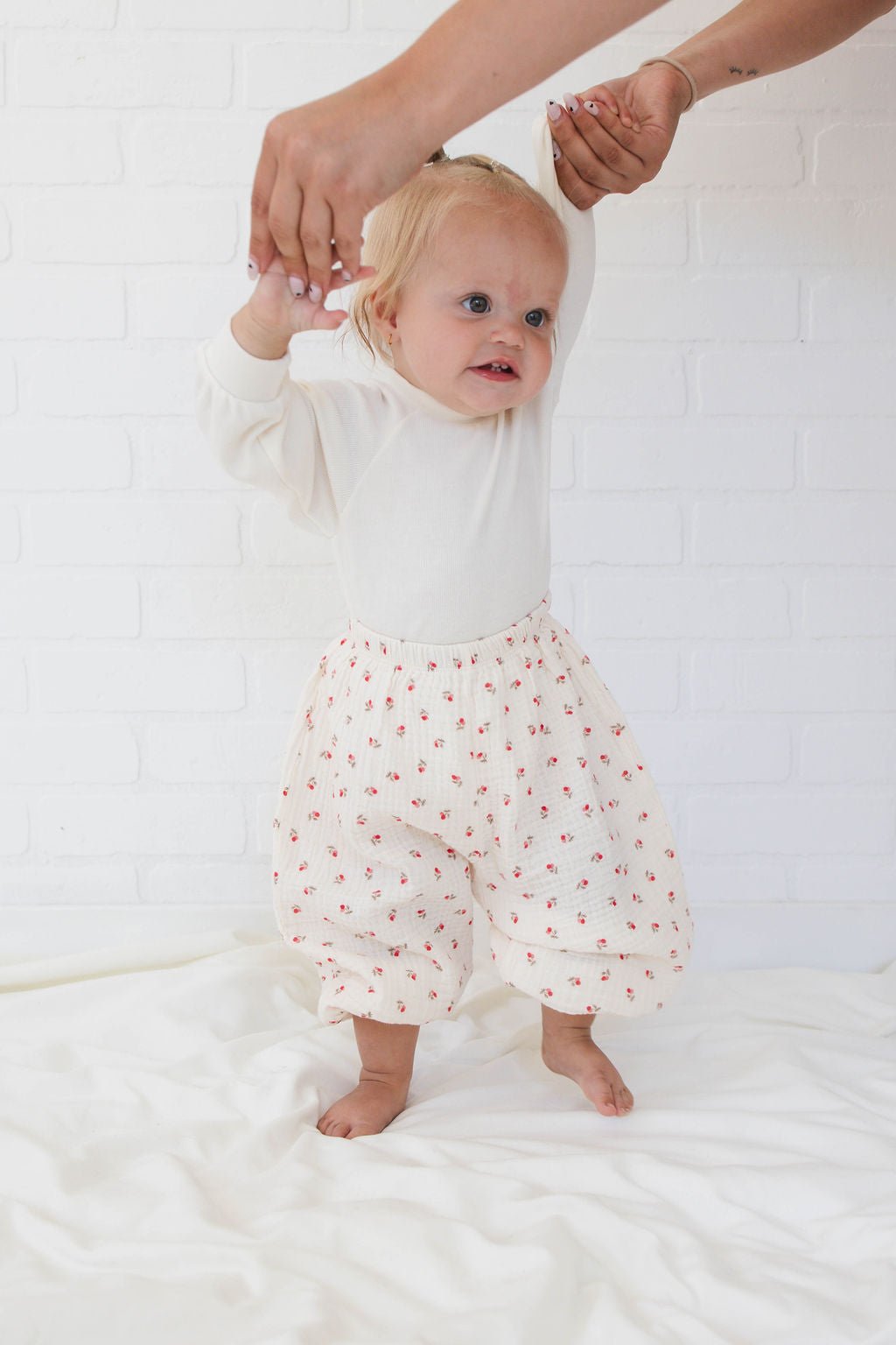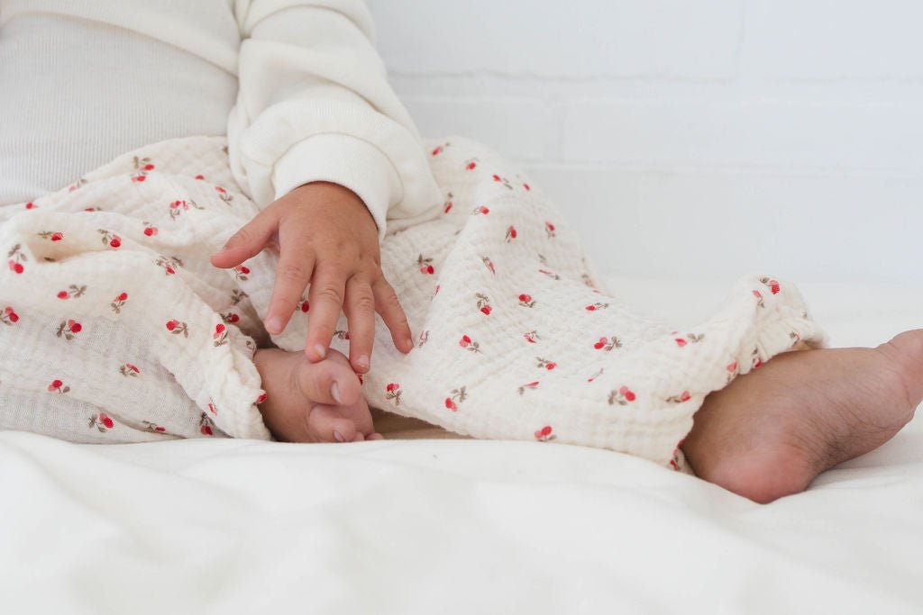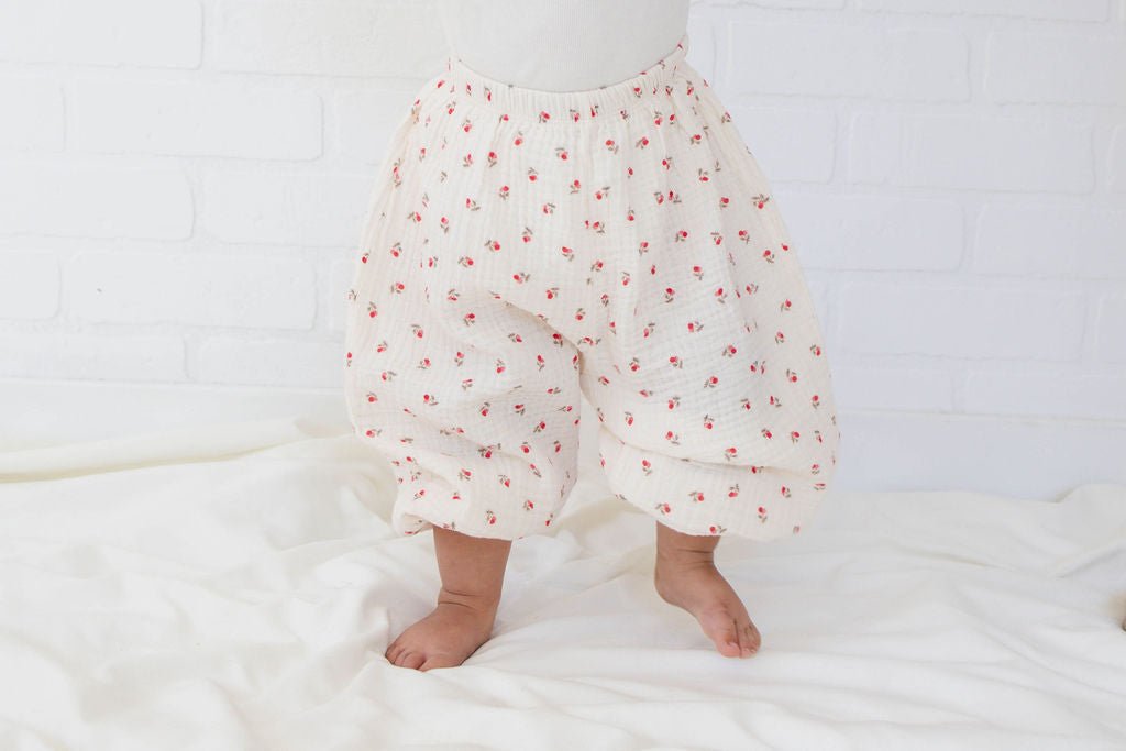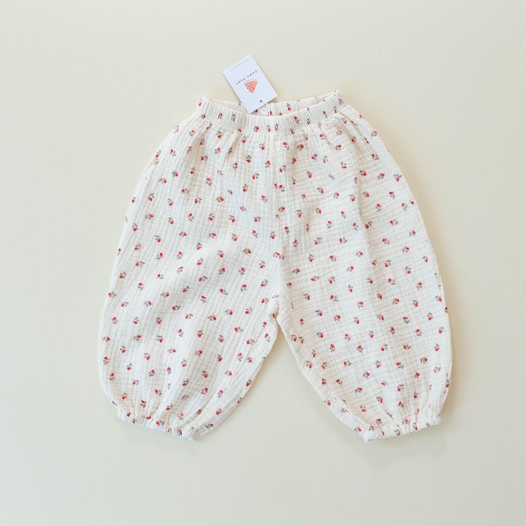 Lightweight slightly quilted texture bottoms and red cherry print brighten your babe's wardrobe. Ideal for warmer weather thanks to breathable cotton, the Sausage Pant brings pop of fun that is easy to pair easy for layering.
