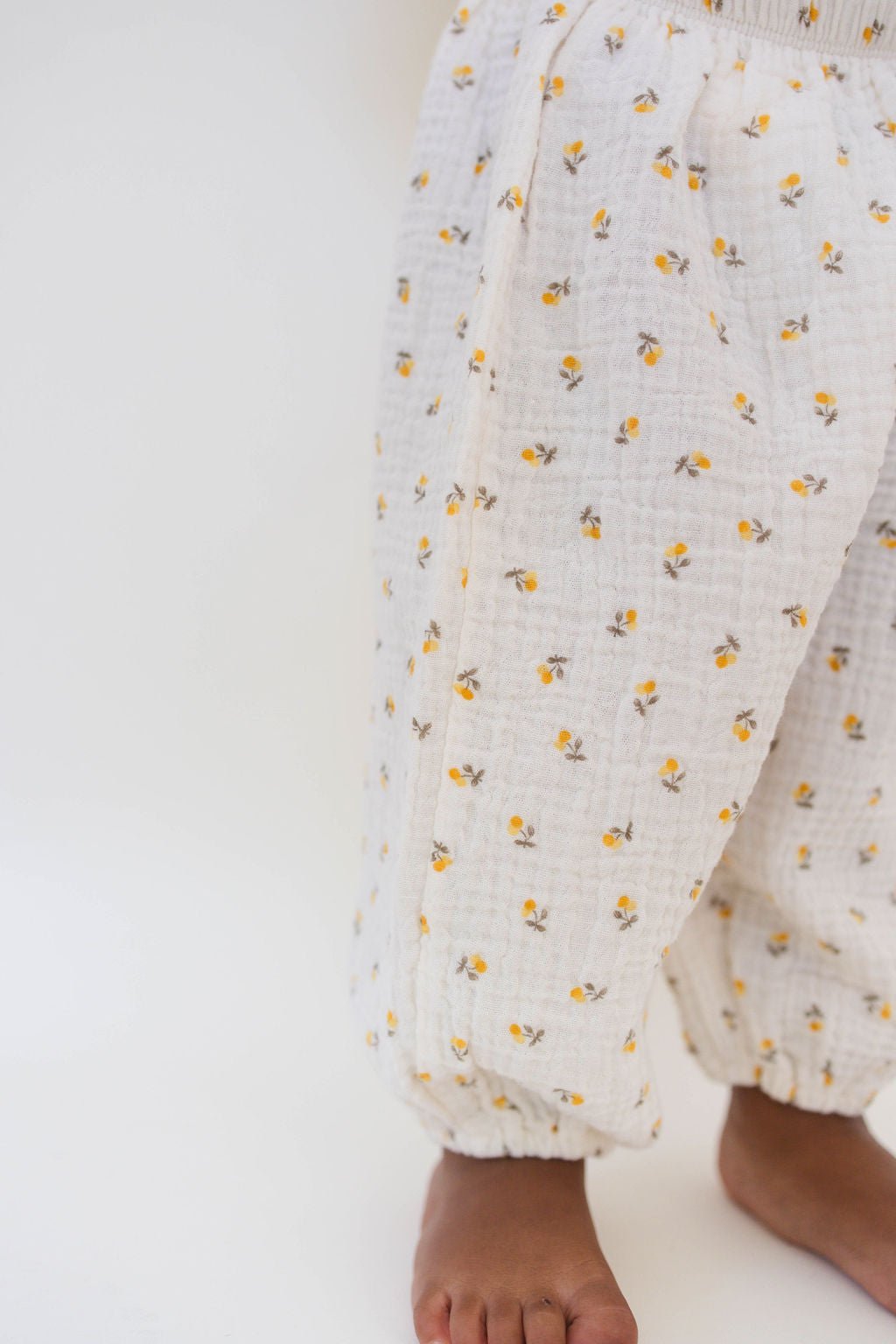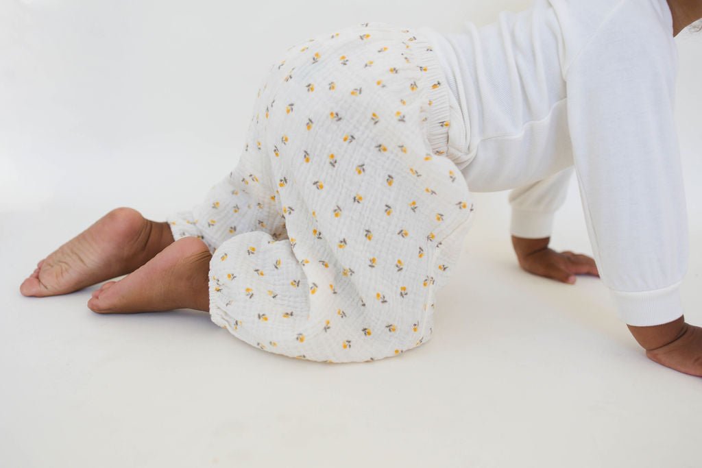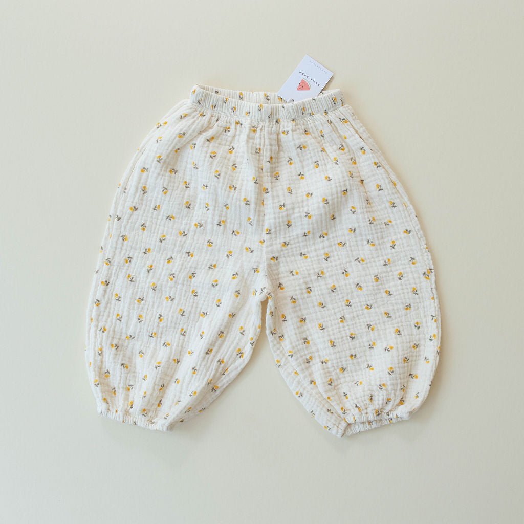 Lightweight slightly quilted texture bottoms and yellow cherry print brighten your babe's wardrobe. Ideal for warmer weather thanks to breathable cotton, the Sausage Pant brings pop of fun that is easy to pair easy for layering.