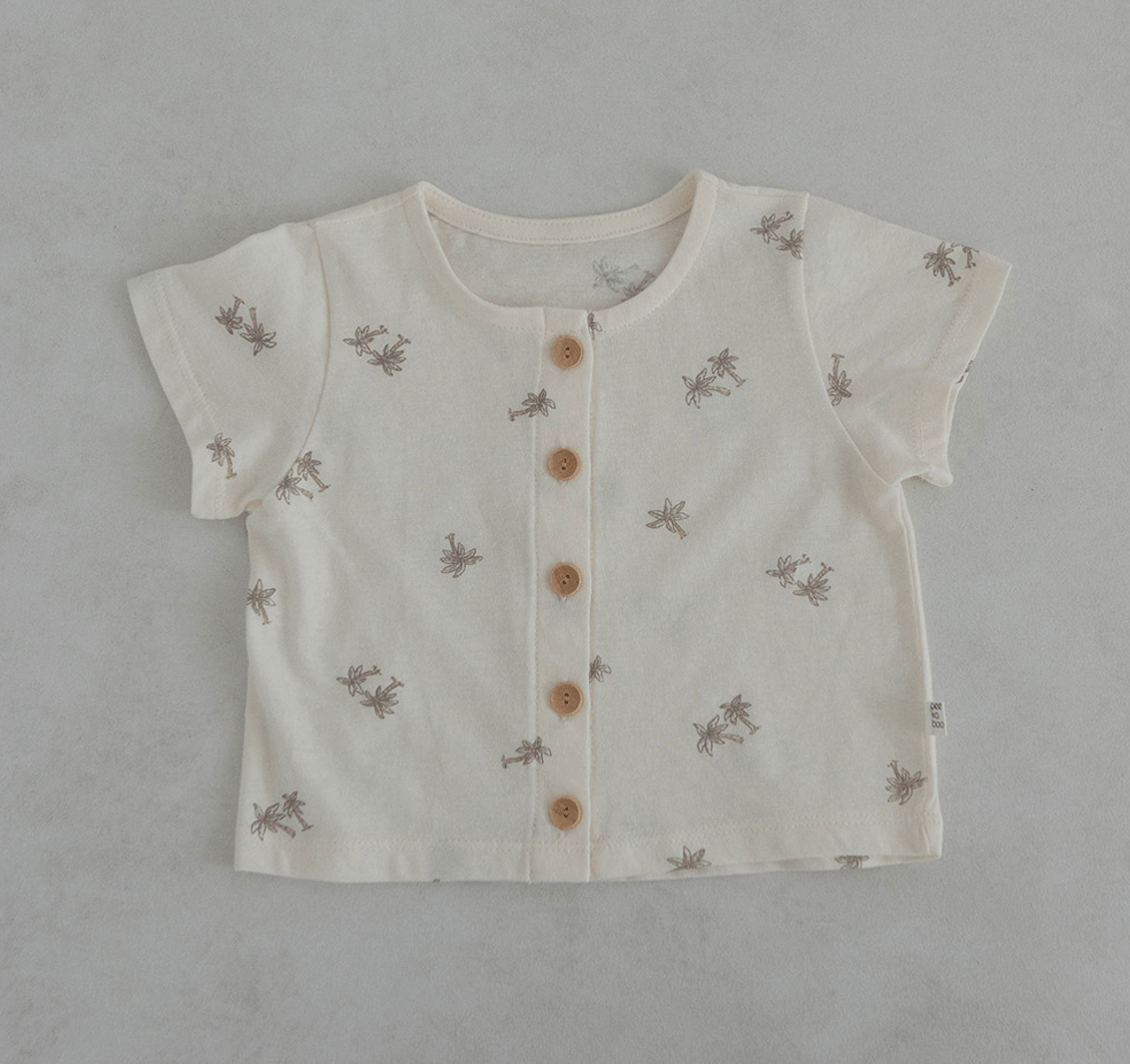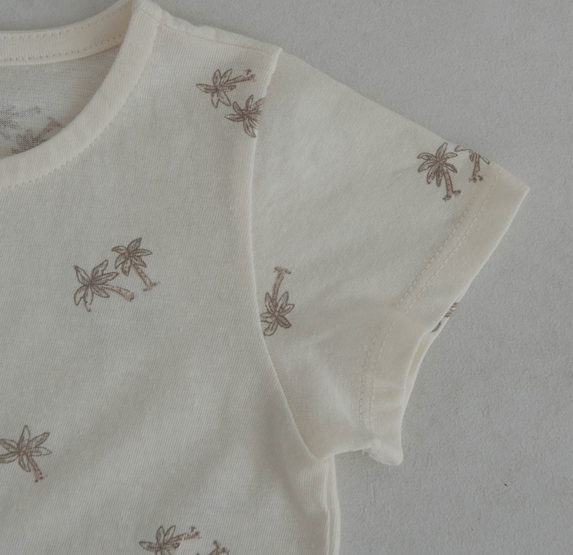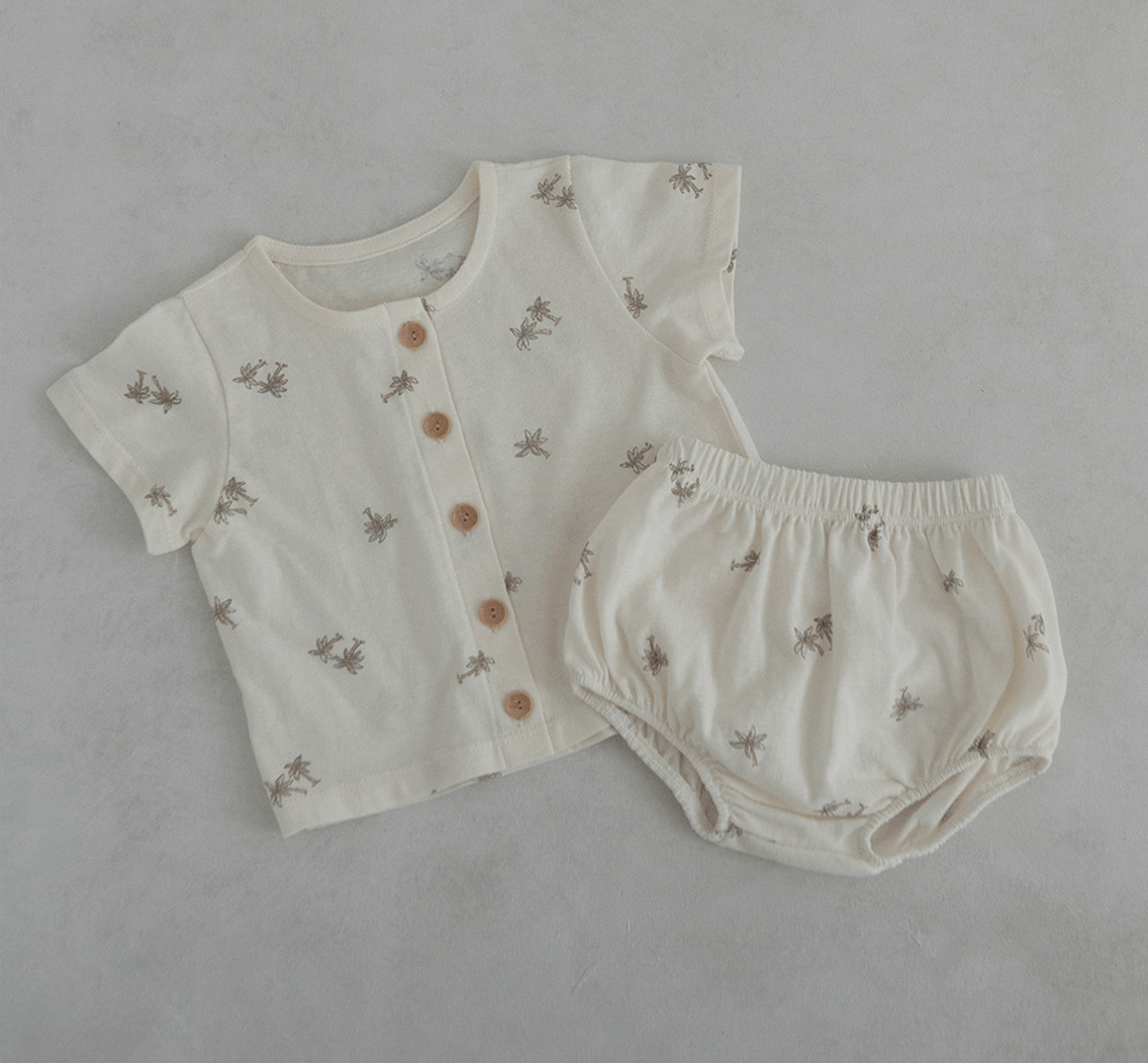 Ivory two piece baby set featuring a palm tree print, a breezy gender neutral outfit perfect for sunny days, vacations, and warm weather adventures.