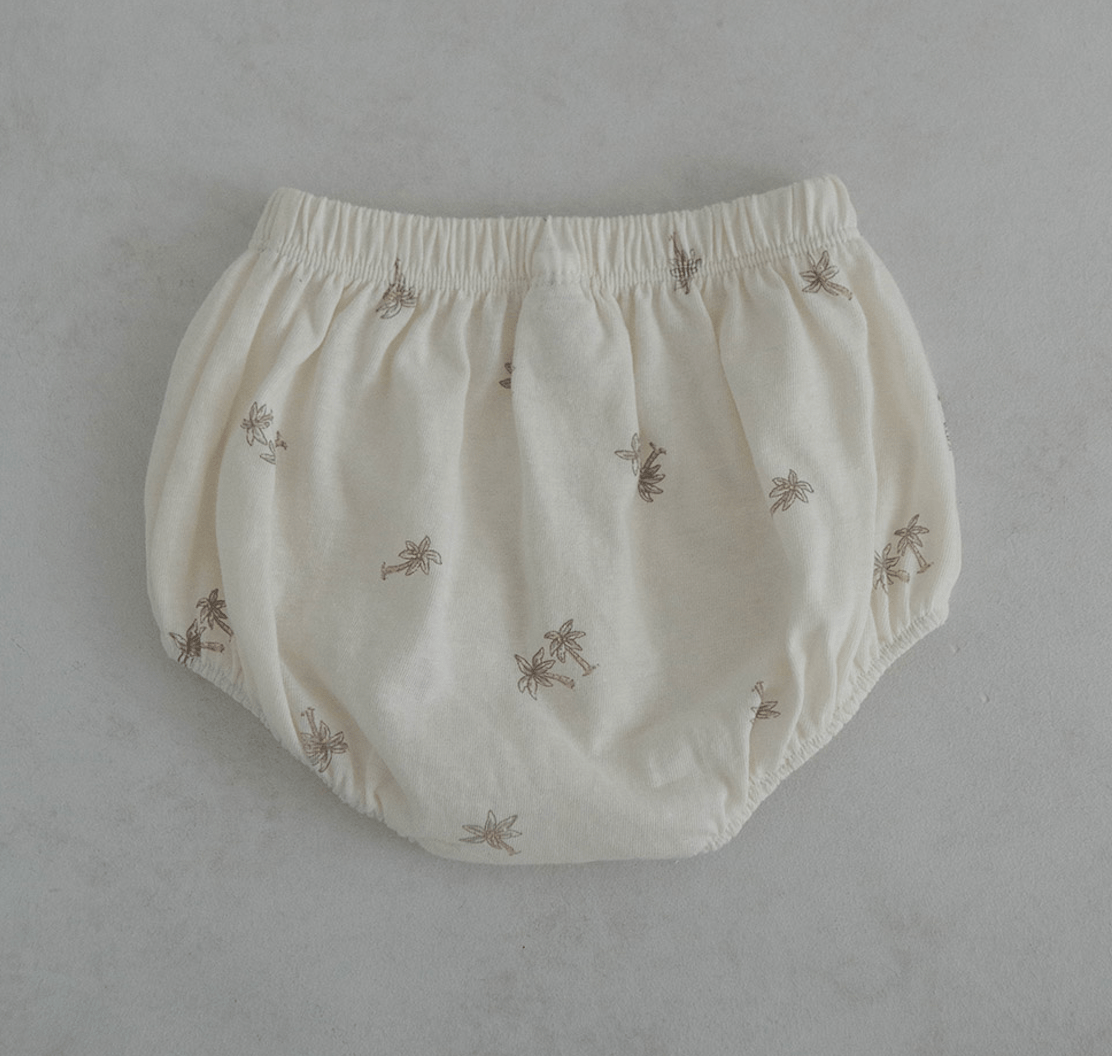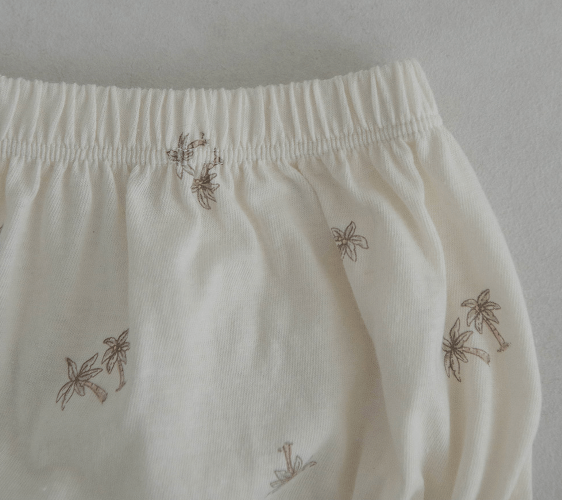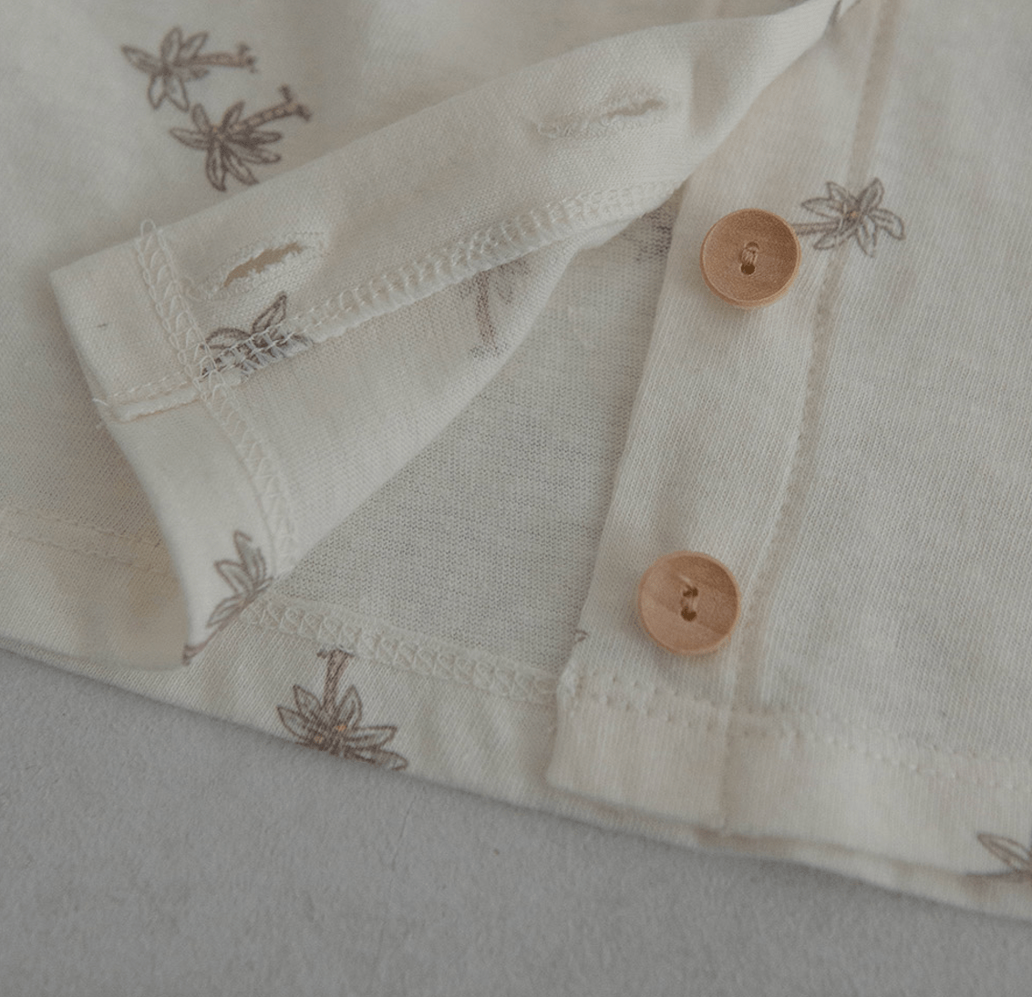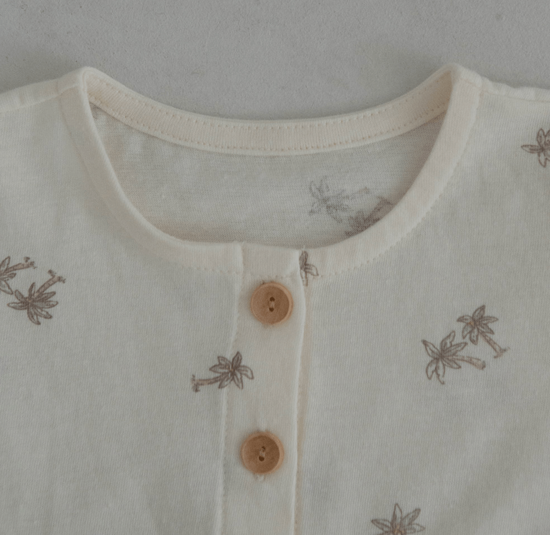Ivory two piece baby set featuring a palm tree print, a breezy gender neutral outfit perfect for sunny days, vacations, and warm weather adventures.