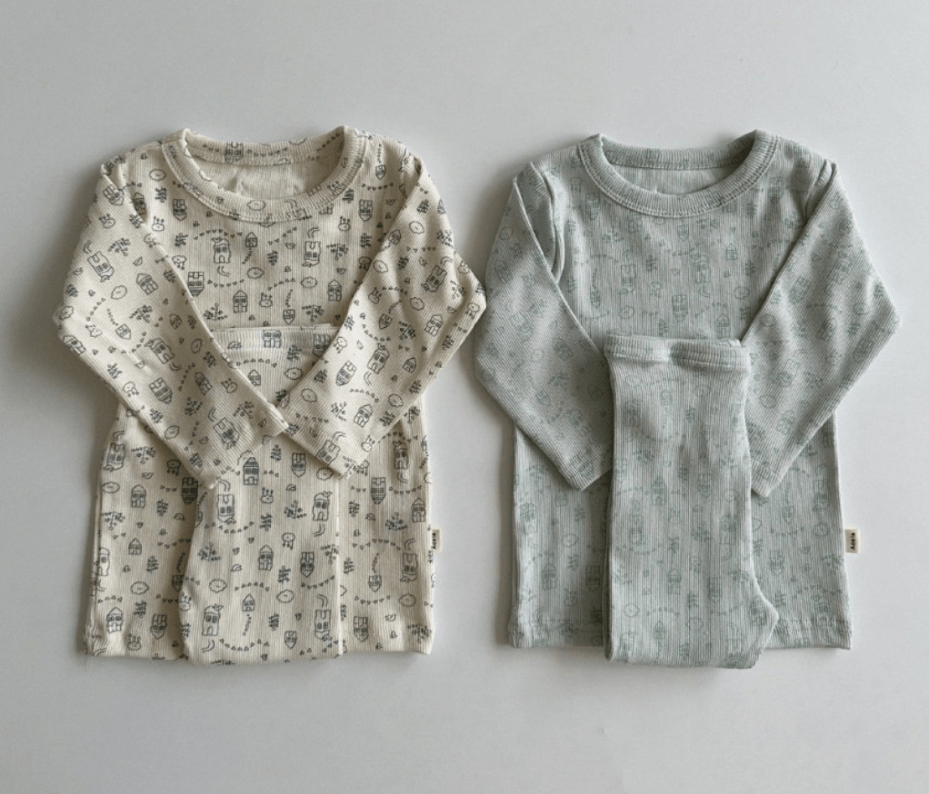 Baby lounge set with long sleeve top and pants in mint blue and off white, a cozy matching duo designed for snug comfort and playful everyday wear. Featuring charming house and cloud prints, this set blends sweetness, softness, and easy movement.
