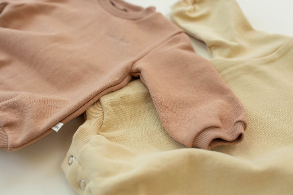 Sweater style onesie in beige with long sleeves, a casual everyday piece that blends cozy comfort with easy wear.