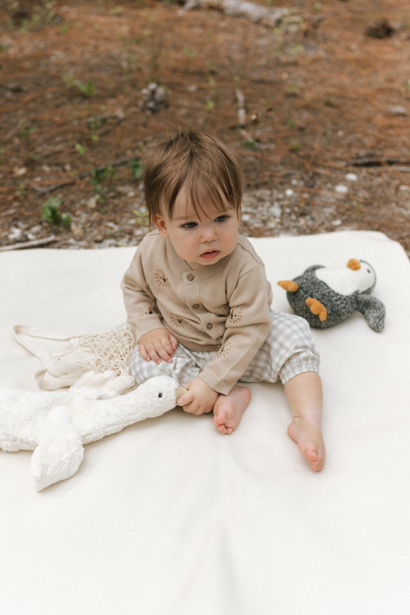 Cozy tan knit cardigan for newborns, babies, and toddlers with charming lion embroidery details — a unisex layering piece that blends warmth, comfort, and playful sophistication.
